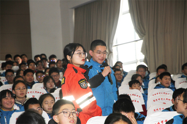 两位老师为同学们讲述红十字的由来和历史,详细解析了心肺复苏的时间、动作、步骤、注意要点和气道异物梗阻的施救方法,并通过复习理论知识、示范、集体模拟等方式强化同学们的认识。与此同时,还让学生代表上台亲身实践,近距离接触“病例”,开展救援实践活动。另外,两位老师还为积极互动的同学送上纪念徽章。