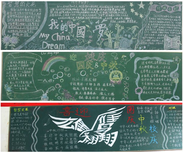 中天“三庆”、国庆、中秋三大节日,鱼贯而入,激荡着每一位中天人的心,催生着每一位中天人的情。校学生会顺势而为,开展系列庆祝活动,而以“营造喜庆氛围 凸显班级文化”为主题的黑板报评比,就是其中的一项欢庆内容。
