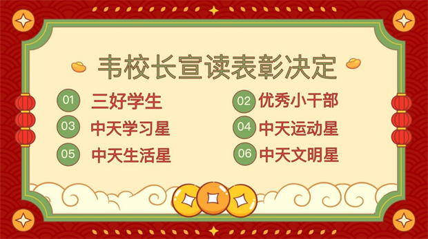 学期的旅程如一首优美的诗篇,每行每字都书写着成长的故事。在这诗意的结尾,韦校长宣读表彰决定,表彰内容包括:三好学生、优秀小干部、中天学习星、中天运动星、中天生活星、中天文明星等。班主任用奖状为中天娃精彩的学期篇章划上圆满的句号。手捧奖状,中天娃的自豪之情油然而生。