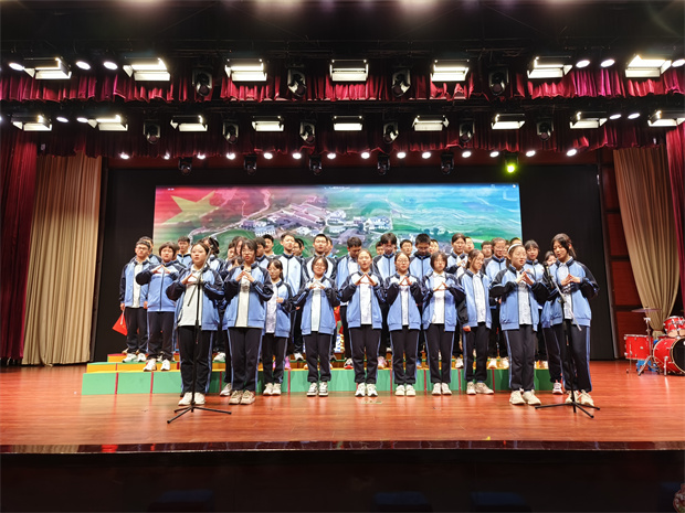 九(12)班的《半生雪》的歌声响起,那声音宛如灵动的百灵鸟,从心间婉转而出,向祖国深情表白。