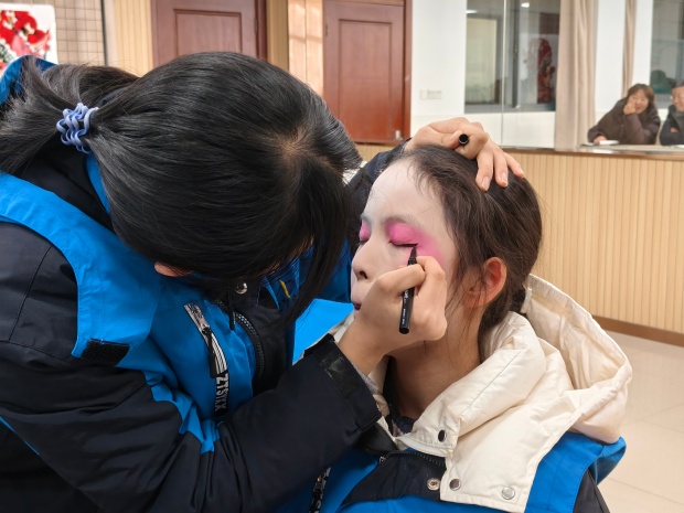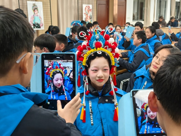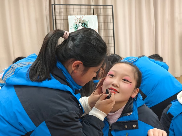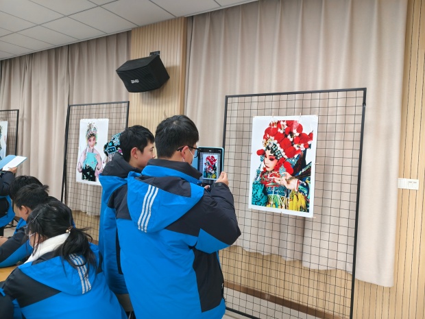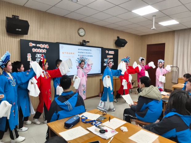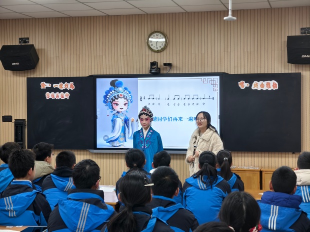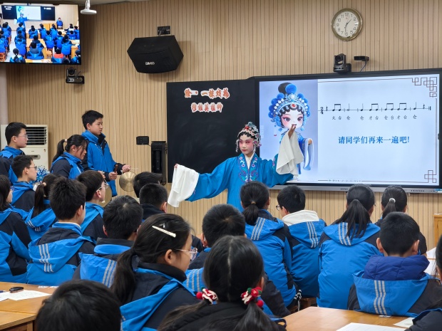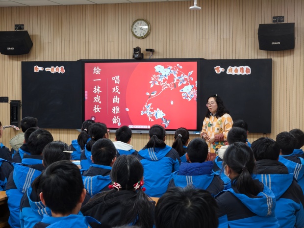 中天实验学校的美术教师方尧、音乐教师薛竣尹共同执教了《绘一抹戏妆,唱戏曲雅韵——AI赋能跨学科学习》展示课。