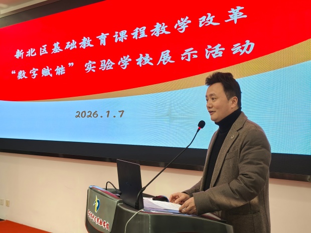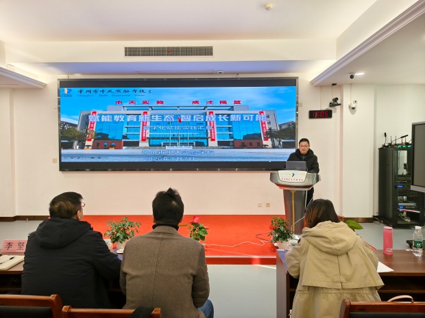 2026年1月7日,新北区教育局在常州市中天实验学校举办了基础教育课程教学改革“数字赋能”实验校展示活动。常州国家高新区(新北区)教育局副局长蒋辉、新北区教管中心副主任李坚、教研室主任周文荣、中学信息科技教研员蒋楠、小学信息科技教研员黄松华以及各数字化赋能实验校分管校长、主任、骨干教师、其他中小学数字化教学负责人参加了活动。活动由教研室主任周文荣主持。